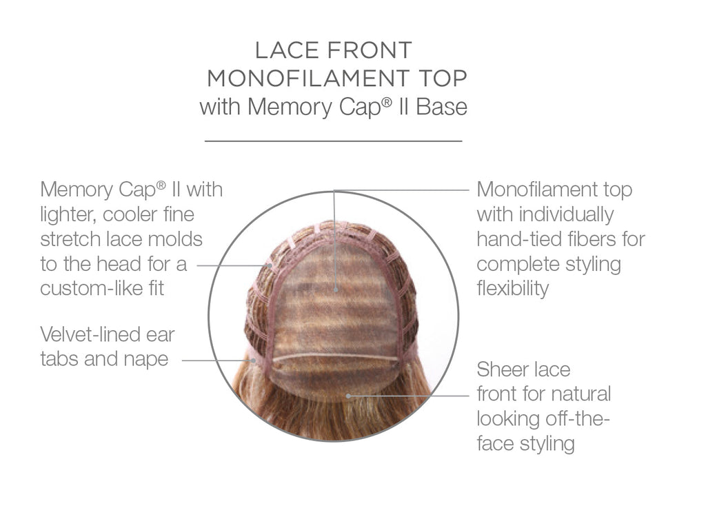 • base design: monofilament top - Creates the illusions of natural hair growth and allows you to part the hair in any direction.