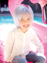 Kensley by Amore is part of the children's synthetic wig collection. It features a classic chin length bob with side swept fringe and face-framing layers. Kensley features a left part monofilament top with a lace front for the most natural look. it is created in a ultra petite sizing for children wear in mind.