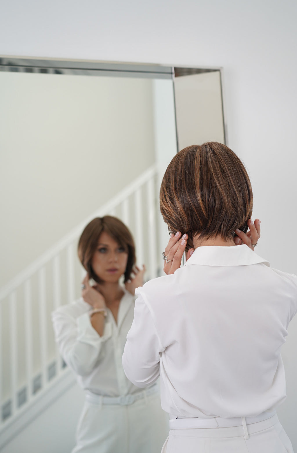 Poised wig features a chic, modern bob that falls just above the shoulders with softly layered ends that curve naturally inward, creating a polished and effortless silhouette. Its rich brown base is enhanced with warm caramel and golden highlights, adding depth and dimension that mimic natural sun-lit hair. The style includes a subtle side part and smooth, sleek texture that frames the face beautifully, giving the overall look a refined, elegant finish. It moves naturally and has a realistic hairline, making it appear sophisticated, timeless, and incredibly lifelike.