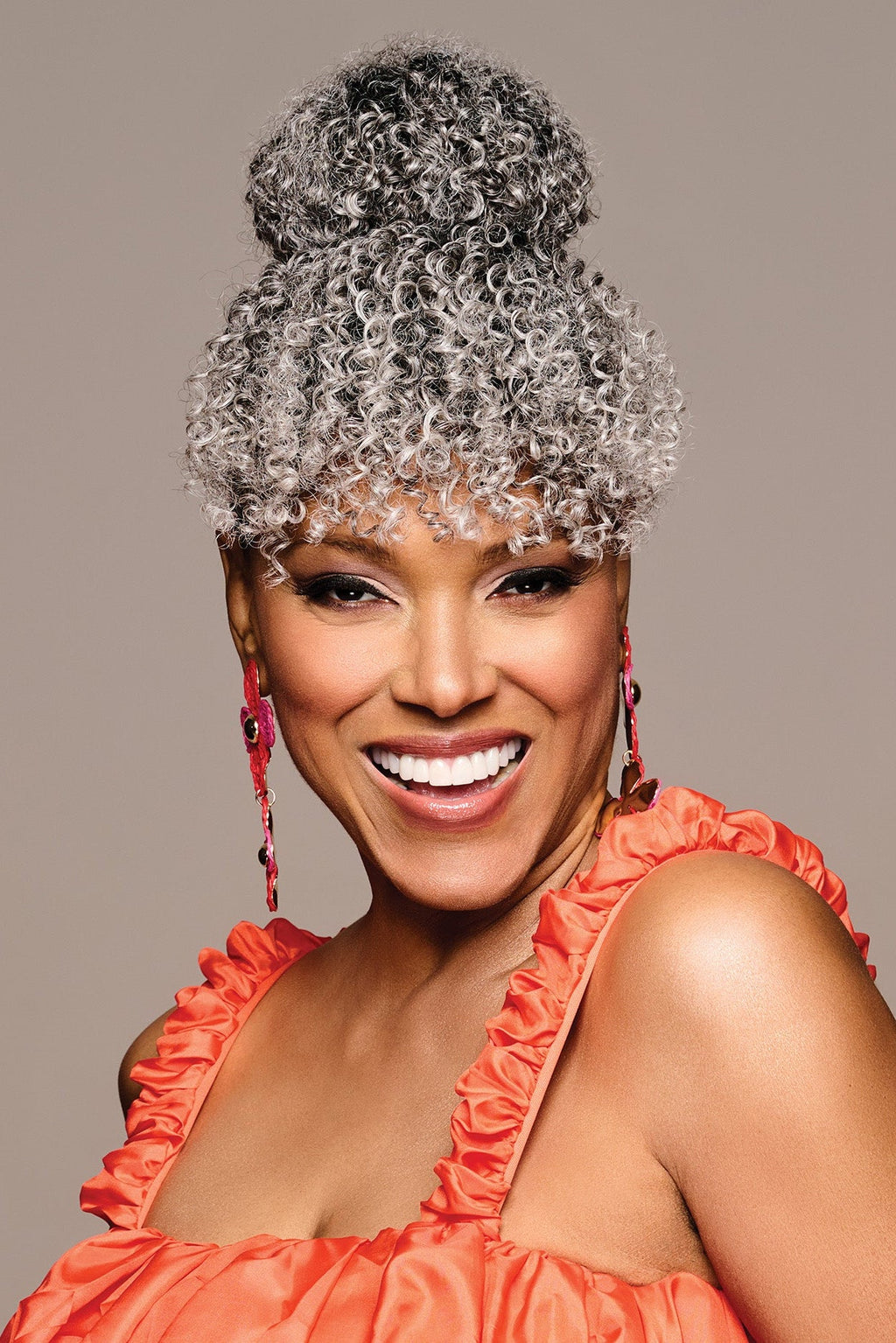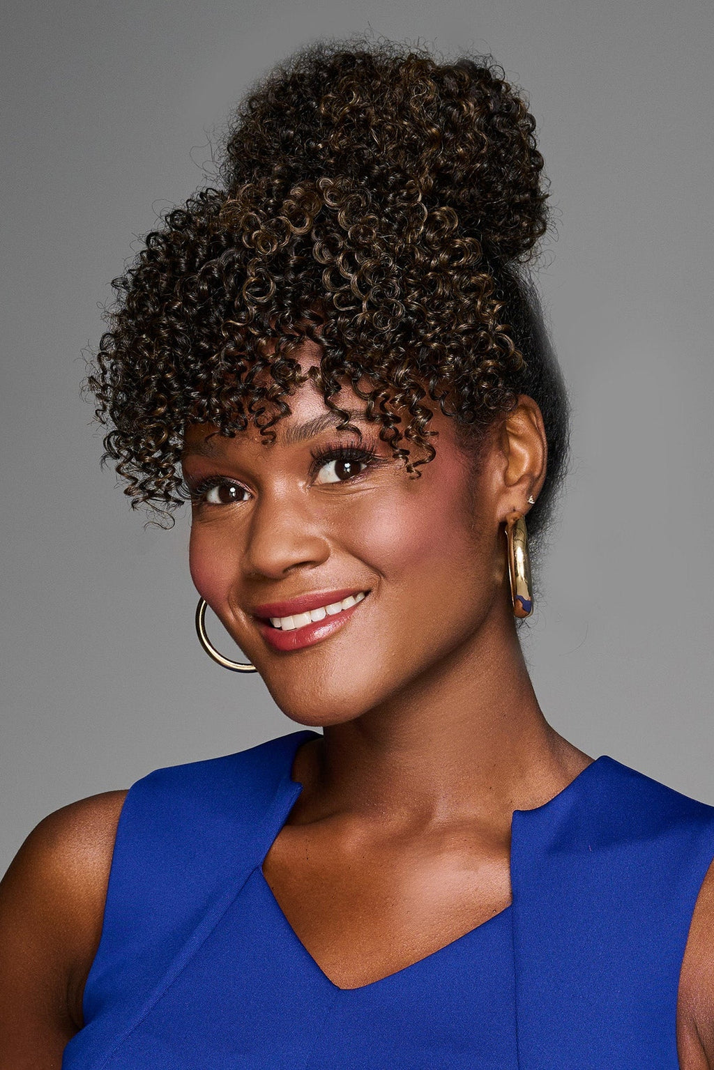 This easy, all-in-one hairstyle is designed to enhance your natural look. Featuring tight corkscrew curls for rich texture without the hassle, the drawstring pocket bun attaches quickly and stays secure with combs. Simply clip on the bangs to complete your flawless style in minutes.