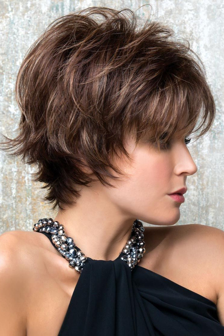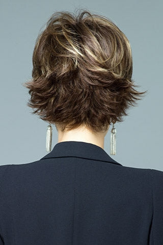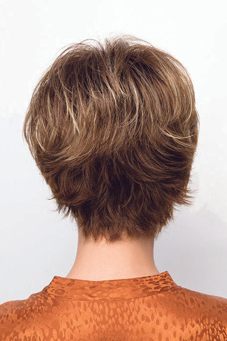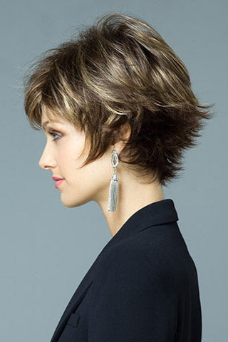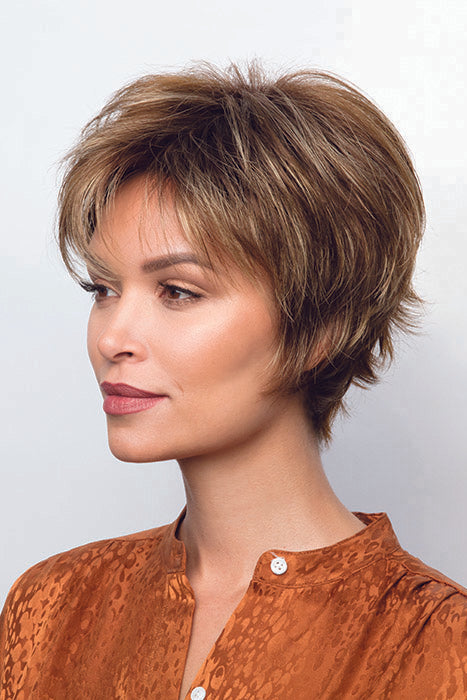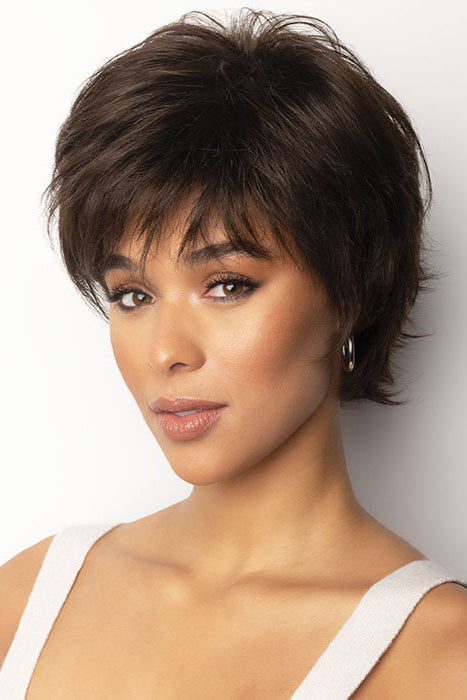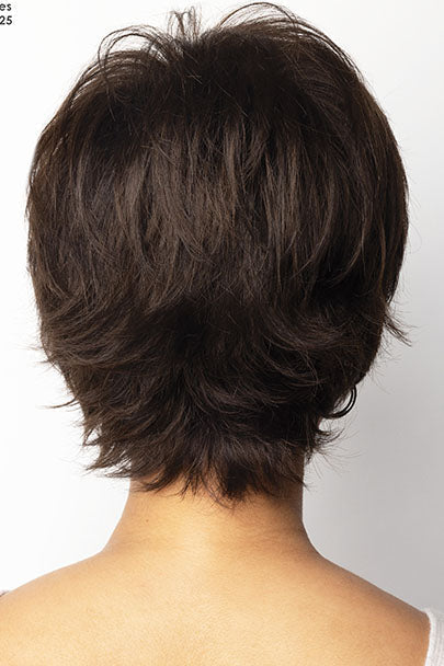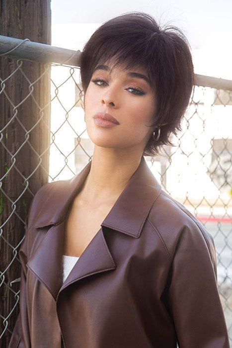 Rene of Paris' Coco is a wispy-textured pixie cut designed for a lightweight feel, thanks to its basic cap construction. The permatease top adds lift and volume by creating a teasing, short-haired crimping effect on the roots.