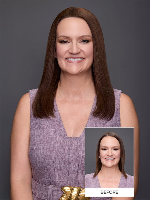 Ideal for those experiencing early to mid-stage hair loss, this topper features a 6” long by 3”–6” wide monofilament base that allows you to part and style the hair in any direction for a realistic appearance. The 100% Remy human hair—expertly crafted from a balanced blend of 50% Chinese and 50% Indian hair—delivers natural movement, soft texture, lasting durability, and full heat-styling versatility. A ¾” polyurethane perimeter supports tape or adhesive wear for a customized fit, while four 1 ⅛” pressure-sensitive clips ensure quick, secure application. The clips can also be removed for wig tape or bonded attachment methods.