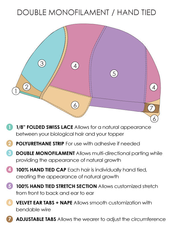 • cap design: double monofilament top, 100% hand tied cap