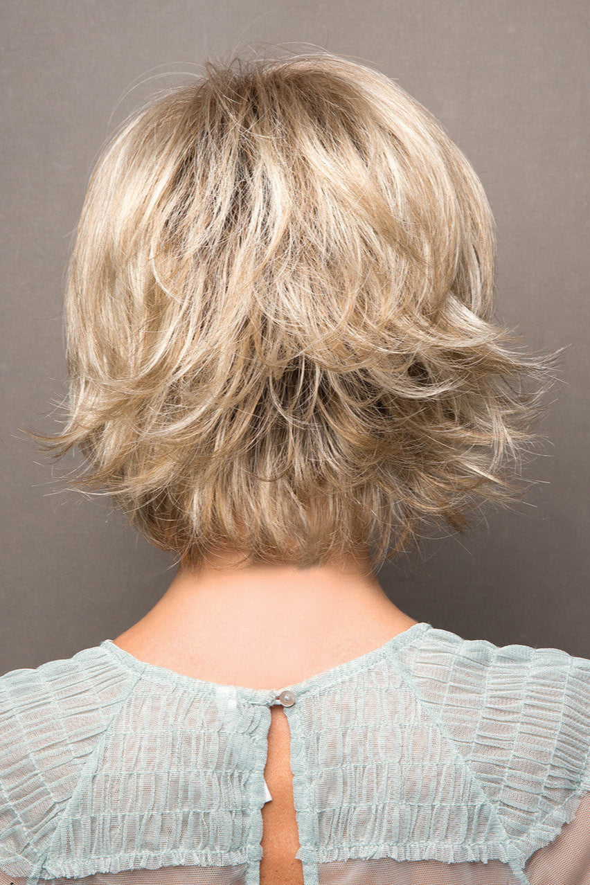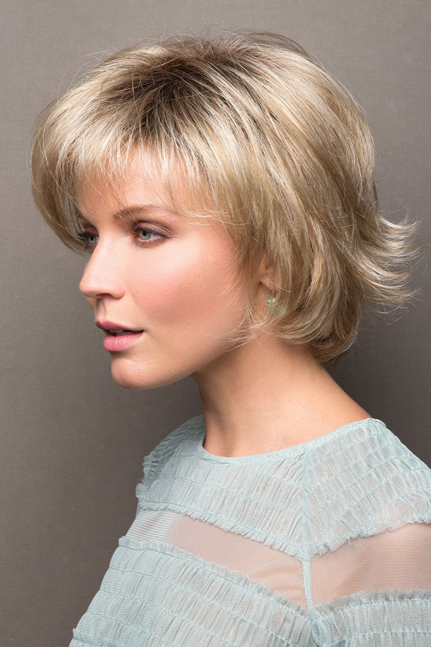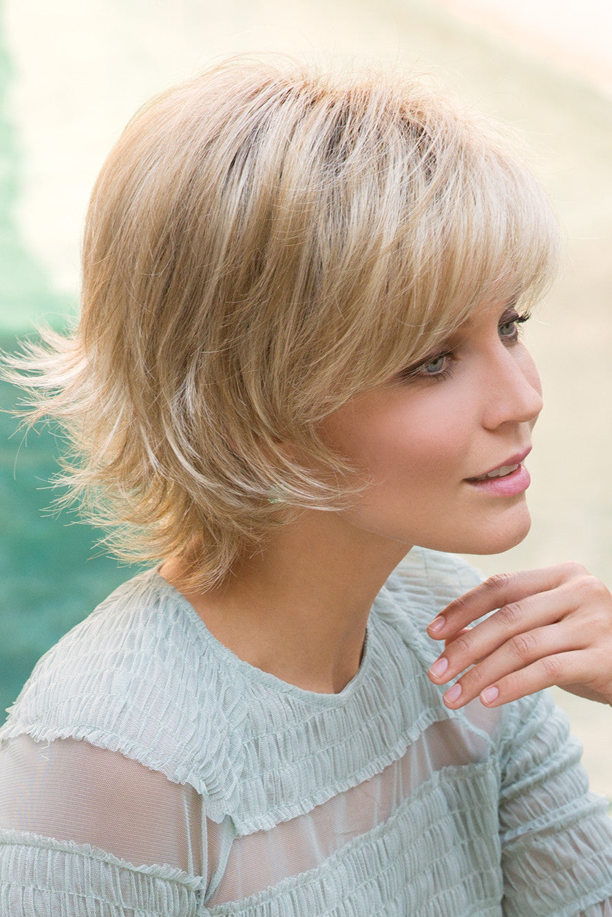 Sky by Noriko is a short, face flattering bob with feathered layers, wispy ends and swept side bang. The open wefts cap construction allows for an airy cool design which is lightweight and ideal everyday wear. Wefted caps adapt very well to the shape of the head and allow air to circulate. Made with a permatease top which is a teasing, short haired, crimping effect on the roots to create more lift and volume.