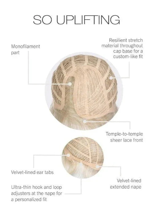 Experience the light and airy feel of So Uplifting by Gabor, with its short, cropped hairstyle featuring a slightly tapered back and extended nape. The shattered layers have razor cut edges for a voluminous look, while the heat friendly synthetic material allows for a smooth and feathery texture. Complete with an extended lace front and monofilament part, this edgy short wig offers a realistic hairline and natural appearance. Don't just settle for any style, elevate your look with So Uplifting.